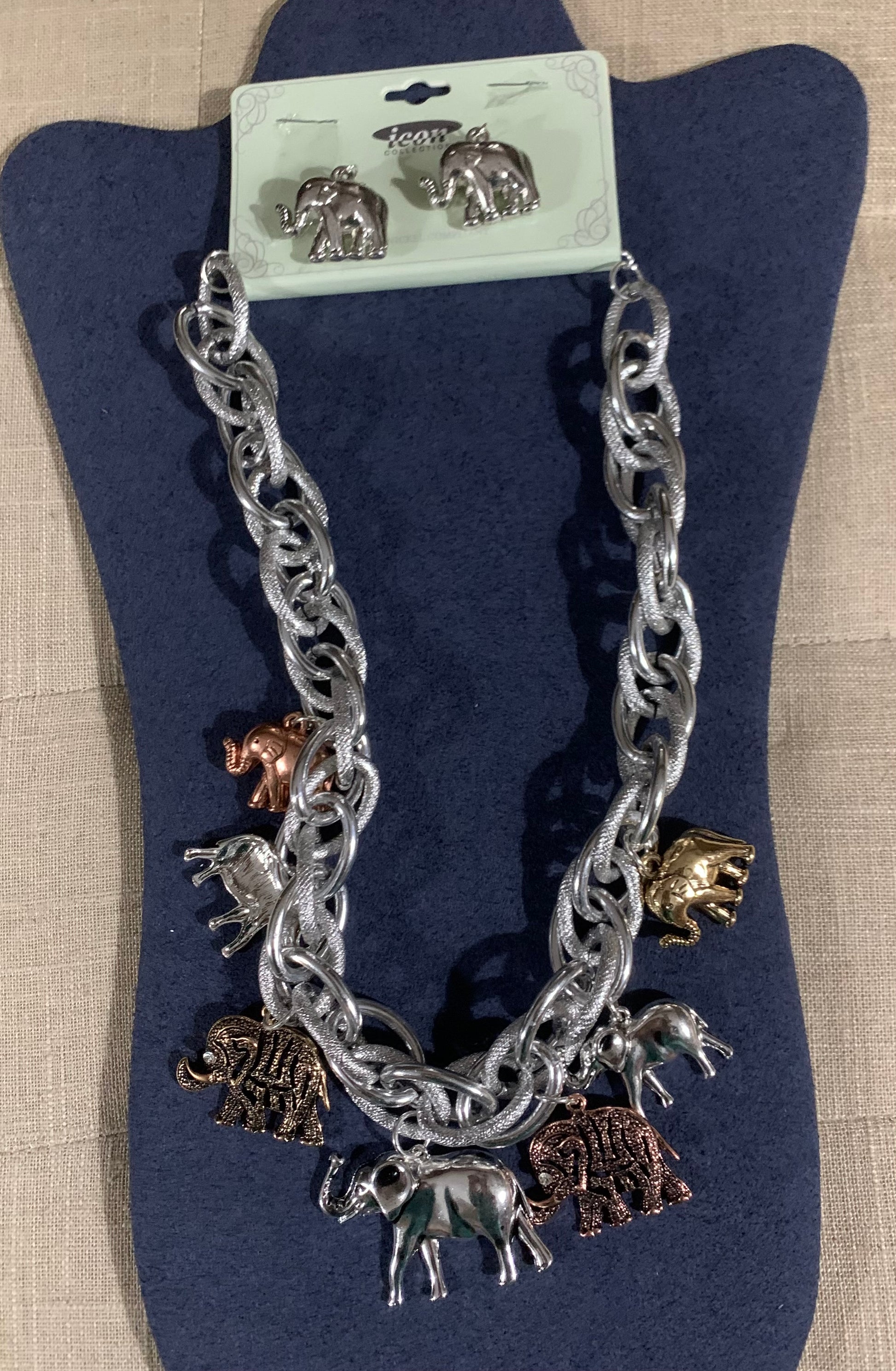 "Enhance any outfit with our Trunk Me Up earring and necklace set, featuring a colorful elephant design. Made with high-quality materials, this set offers a unique and playful touch to your jewelry collection. Perfect for animal lovers and bohemian fashionistas alike.